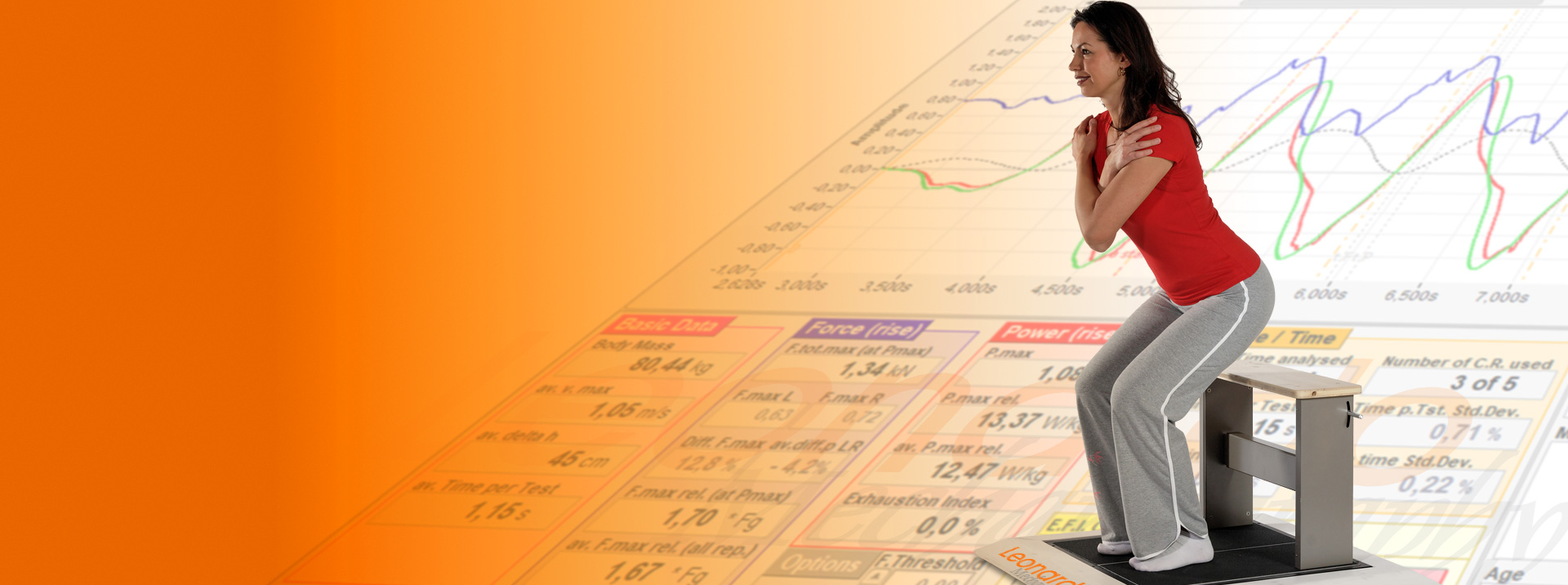 Zielsetzung/Ergebnisse: Beurteilung der individuellen anaeroben Leistungsfähigkeit (peak Power Output), Referenzdaten mit Alter/Geschlecht (EFI) im Alter von 3 bis 100, Bestimmung der Effizienz der Bewegung (inter- und intramuskuläre Koordination im gesamten Körper), L/R-Unterschiede – liegt eine asymmetrische Bewegung vor? (Typische Gründe: Schmerzen/Schonhaltung, verletzungsbedingte asymmetrische Bewegungsmuster, Bewegungsapparat und Rücken.) Messwerte: Kraft, Beschleunigung, Geschwindigkeit, Leistung, kinetische Energie, potentielle Energie, Sprunghöhe, Ausholbewegung, Gewicht, L/R-Differenzen (Kraft, Leistung), Esslinger Fitness Index (E.F.I.), Bewegungseffizienz.